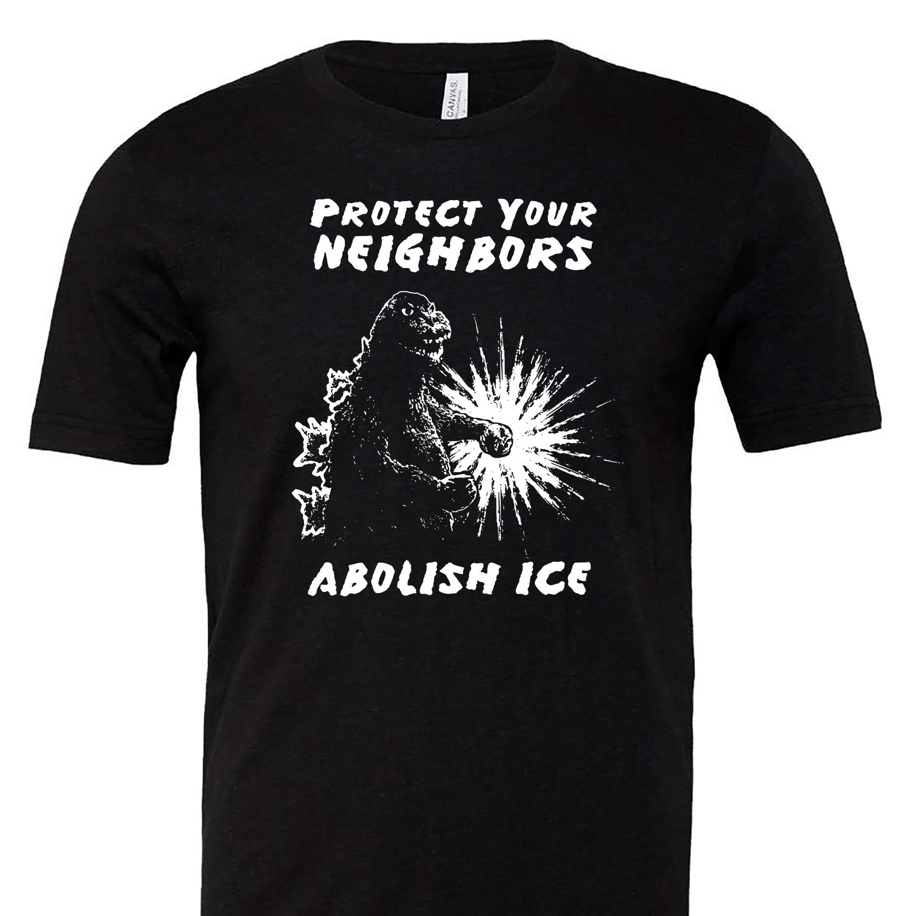 The new PROTECT YOUR NEIGHBORS / ABOLISH ICE shirts are here! Stand up for your neighbors and get ICE out of our communities! Printed on a black preshrunk t-shirt with white ink; shirts will ship in approximately 2-3 weeks.