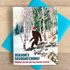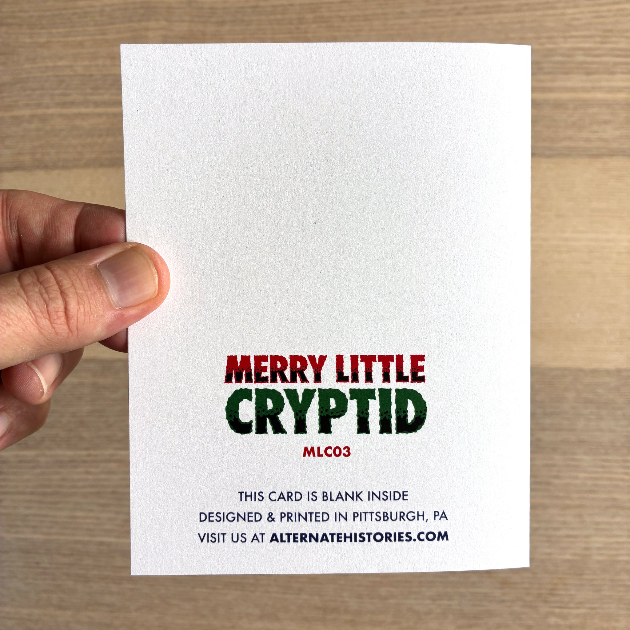 Saying "Season's Greetings" is so last year; all the cool kids are saying "Season's Sasquatching" with this 4.25 x 5.5 inch card! Designed and printed in Pittsburgh, the card is blank inside and comes with a mailing envelope. Part of our charmingly ridiculous Merry Little Cryptid Series; also available in a variety pack!