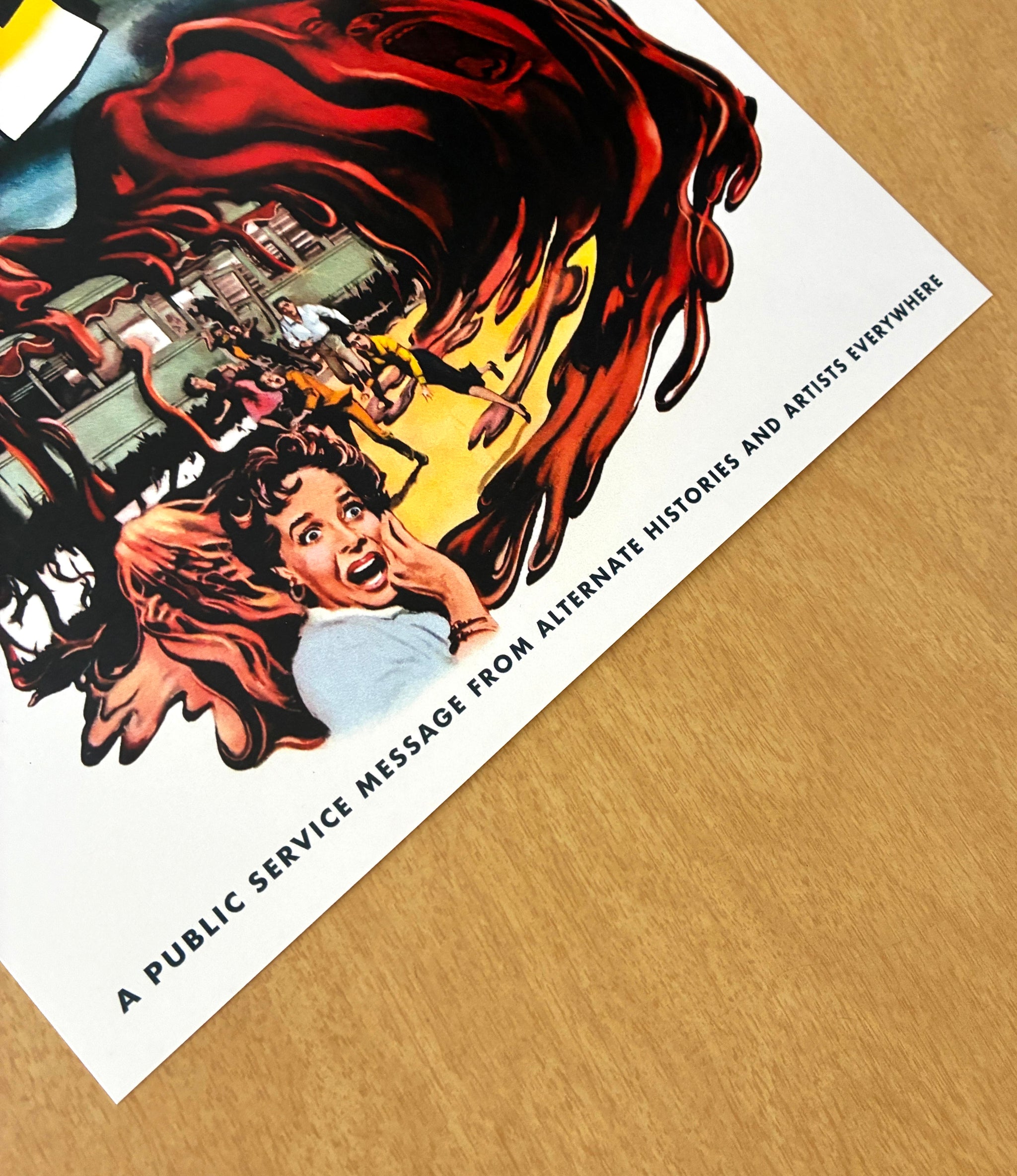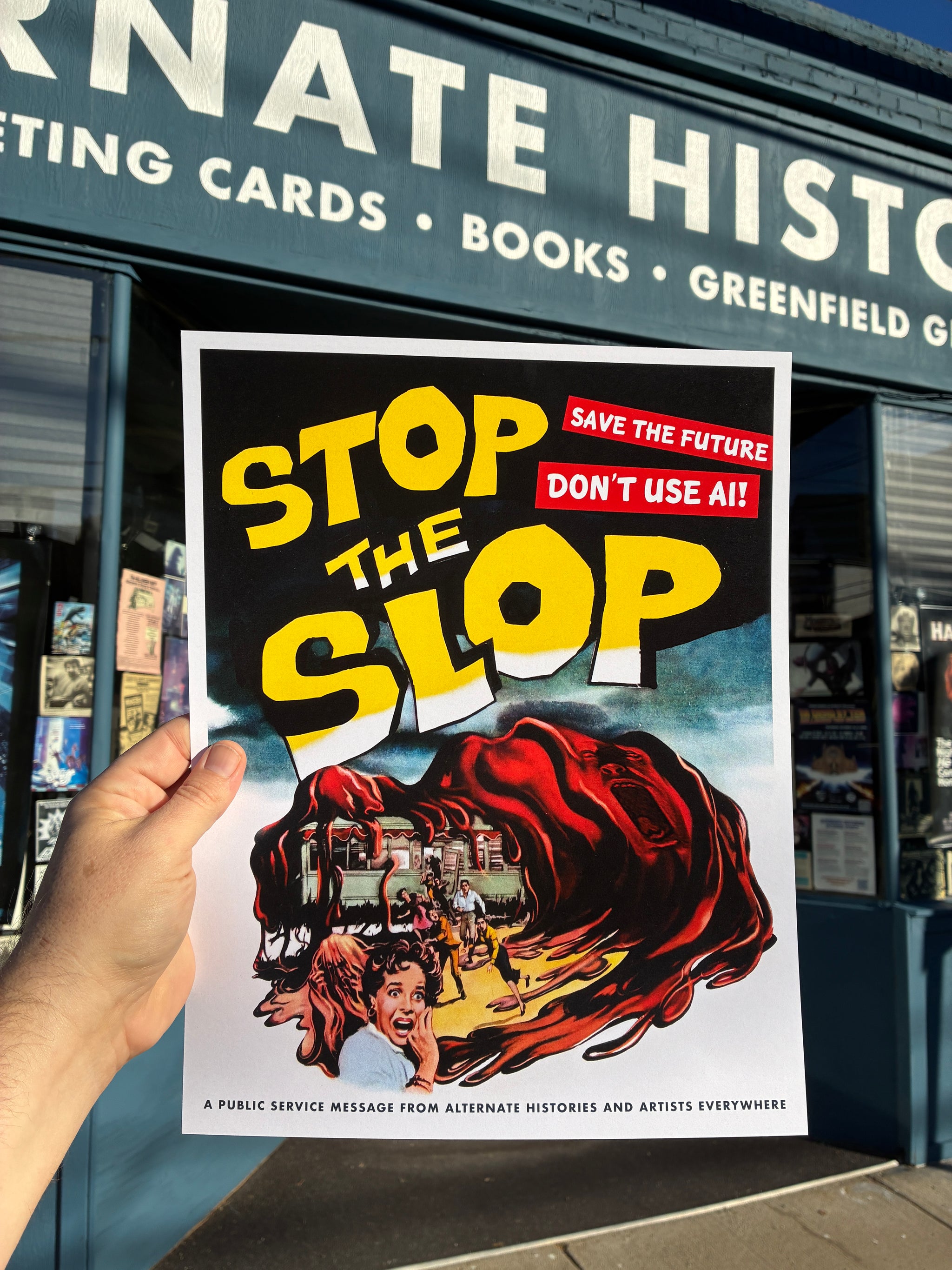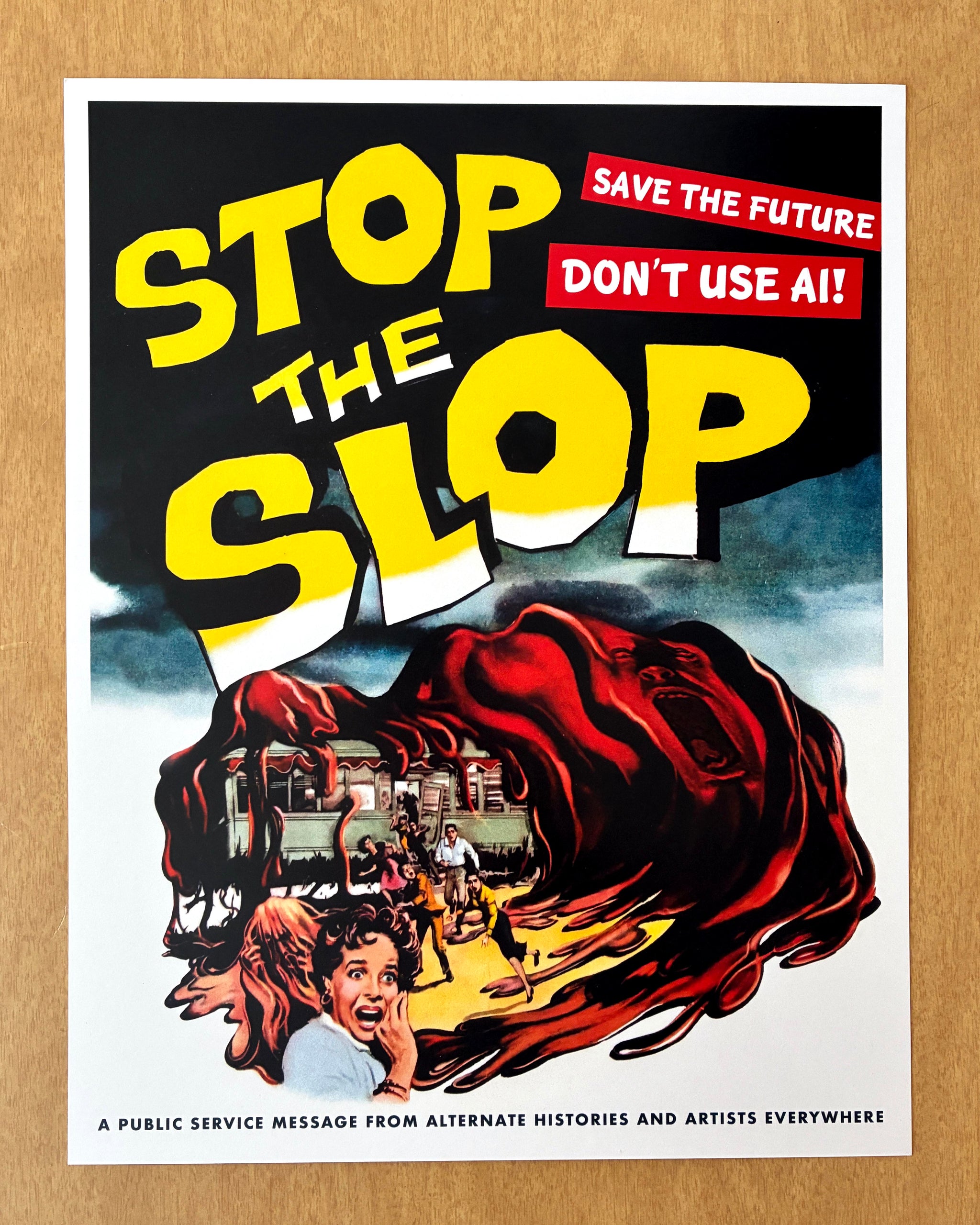 Now more than ever, it's time to Stop The Slop! Stop using AI which poisons our brains, drains our water, and is using all of our power grid and ruining the economy to create garbage. This 11 x 14 inch print is designed and printed in Pittsburgh, PA by a tired, cranky, and very much human artist. Comes with the friendly label/warning at the bottom that "This is a public service message from Alternate Histories and artists everywhere." Buy one here for $15 and support a cranky human, or download it here and share it online or wherever!